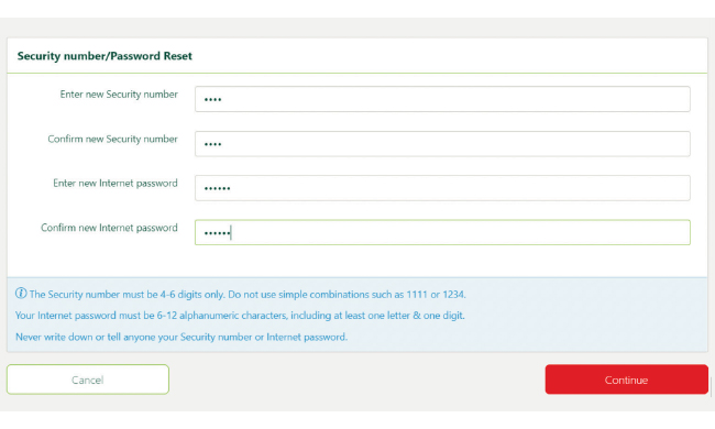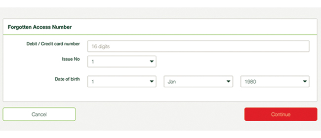 3. If you’ve forgotten your Access Number enter your card details and date of birth. If you’ve forgotten your password enter your Access Number. Tap Continue.