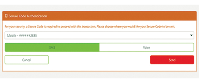 Select one of your registered phone numbers to receive your Secure Code. This can be sent via SMS or voice message. Tap Send. Enter your secure code and tap Authenticate.