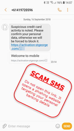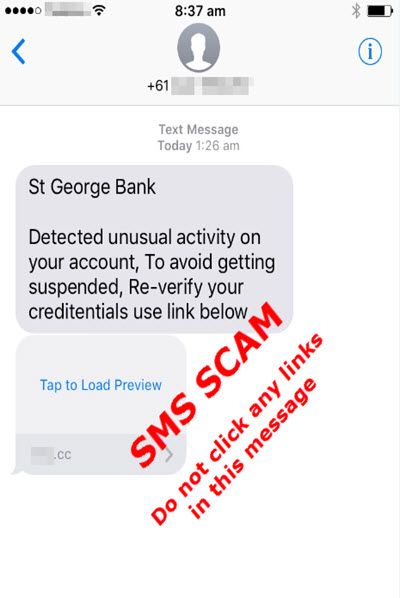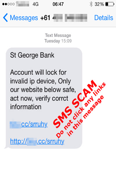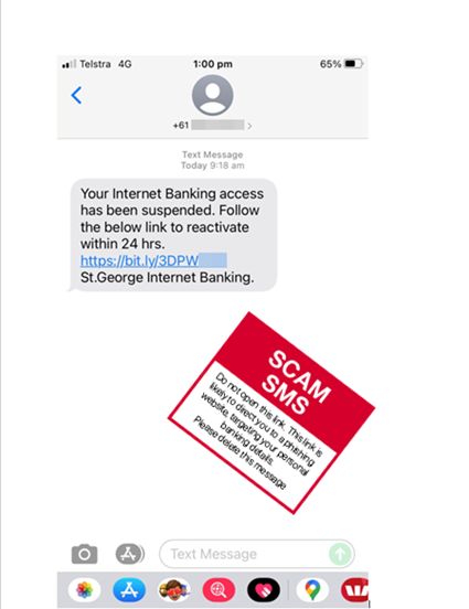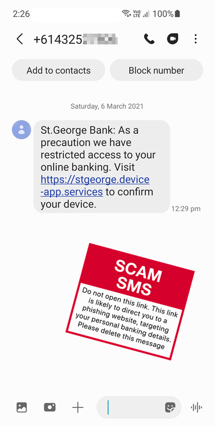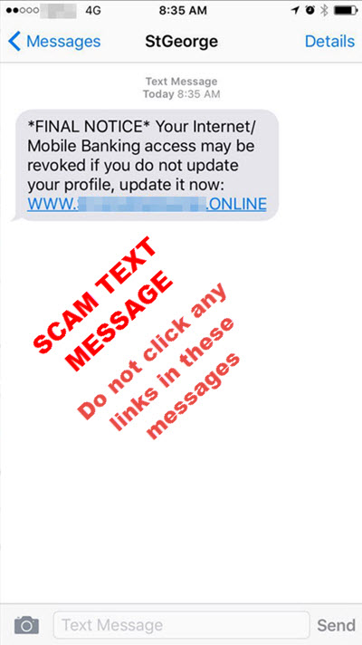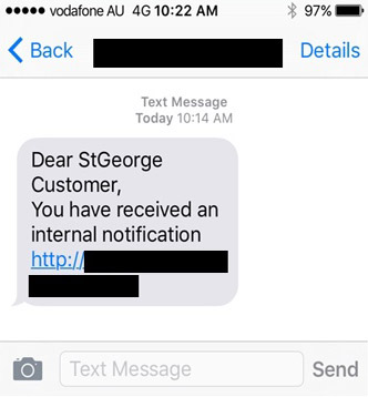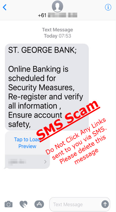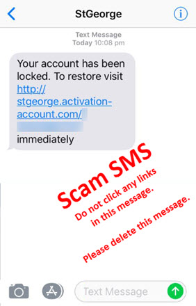 Be aware - The phone number in this SMS is for St.George, however the link will not take you to a St.George website. Never use a link received in an email or to sign into your banking. Always type stgeorge.com.au into your browser, or use the App, to securely access your banking.