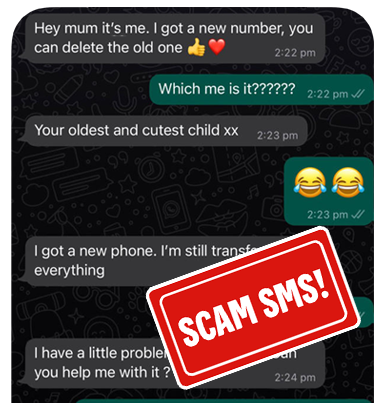 This particular scam, commonly received via WhatsApp or other messaging apps, is designed to convince parents their child has a new phone number. The claimed child does not provide their name, but indicate they are a part of the family by responding with wording like "Your oldest and cutest child".
