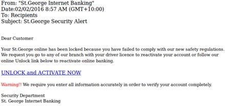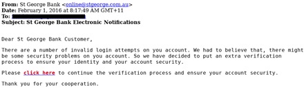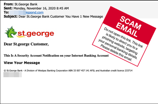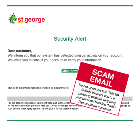 We've been made aware of scammers impersonating St.George staff members via email. These emails usually include offers with slightly higher interest rates than publicly advertised, professional appearing brochures and account opening application forms.