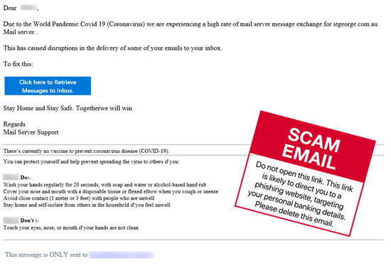 We've been made aware of scammers falsely claiming to represent St.George, offering slightly higher than advertised Term Deposit rates. Reports include emails sent from domains that are similar to St.George, these include info@stgeorge-wealth.com, info@stgeorge-capital.com and info@stgeorge-fixed.com.