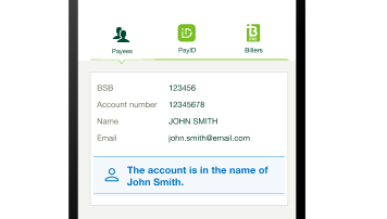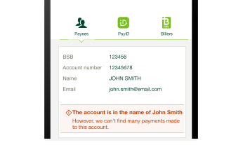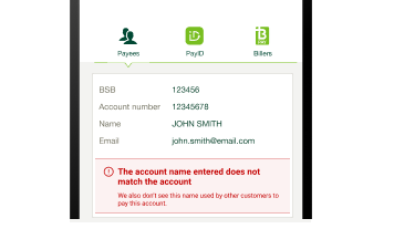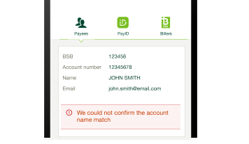 Where available, we’ll let you know if the account details you've entered (account name, BSB, and account number) matches the details held by the recipient's financial institution or matches the details commonly used by other St.George customers in previous payments data. We'll also let you know if we experience issues checking the bank records.