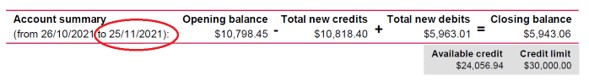 Your Autopay repayments will start on your current payment due date if your Autopay has been set up before 11pm AEST/AEDT on the “to date” shown in the “Account Summary” section on your current statement. If it has been set up after this date, then you will need to continue to make a manual payment until you receive your next credit card statement. See screen shot below to find where the “to date” is shown on your statement.
