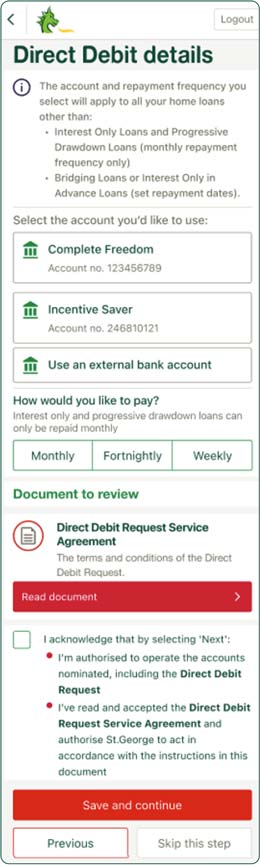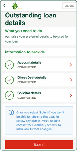 Nominate an account, set up your repayments and share your solicitor’s details.